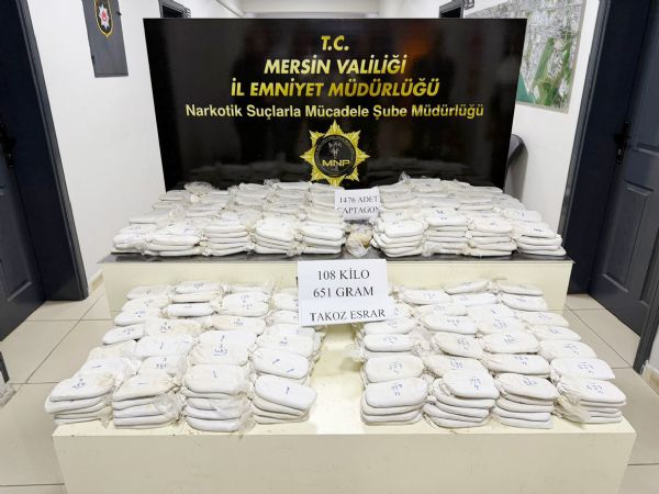Mersin İl Emniyet Müdürlüğü Narkotik Suçlarla Mücadele ve İstihbarat Şubeleri ile MİT Başkanlığı uyuşturucu ile mücadele çerçevesinde ortak çalışma yaptı. Ekiplerin yaptığı hassas, titiz ve takipli saha çalışmaları ile merkez Yenişehir ilçesinde bir adres belirlendi. Adrese operasyon düzenleyen polis yabancı uyruklu T.M.'yi gözaltına aldı. Evde yapılan aramalarda siyah çantalar içerisinde piyasa değeri yaklaşık 33 milyon lira olduğu öğrenilen 108 kilo 651 gram takoz esrar ile bin 476 adet uyuşturucu hap ele geçirildi.