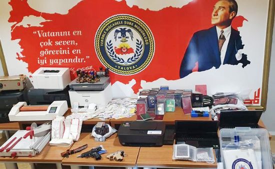 Açıklamada, şüphelilerin saklandıkları ve ofis olarak kullandıkları adreslerde yapılan aramalarda ise, 2 adet tabanca ve fişekler, sahte pasaport ve kimlik yapımında kullanılan 9 adet teknik makine, sahte mühür ve ekipmanları ile 433 adet çeşitli ülkelere ait düzenlenmiş pasaport, 346 adet sahte kimlik belgesi ile çok sayıda doküman ele geçirildiği de vurgulandı.