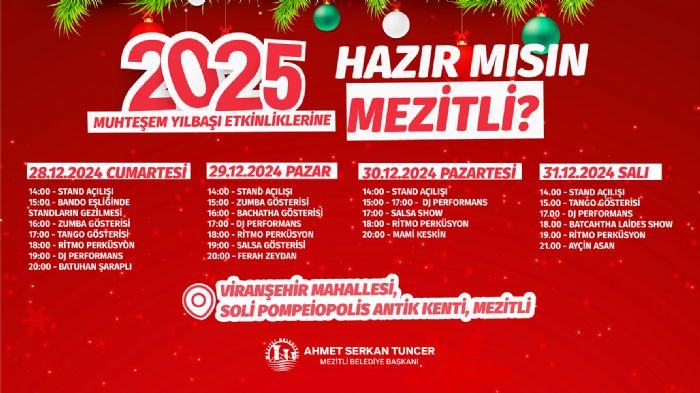 Mezitli Belediyesi, 2025 yılına büyük bir coşkuyla merhaba demek için dolu dolu bir etkinlik programı hazırladı. Etkinlikler, 28 Aralık Cumartesi günü başlayıp 31 Aralık Salı günü sona erecek ve Viranşehir Mahallesi, Soli Pompeipolis Antik Kenti’nde düzenlenecek.