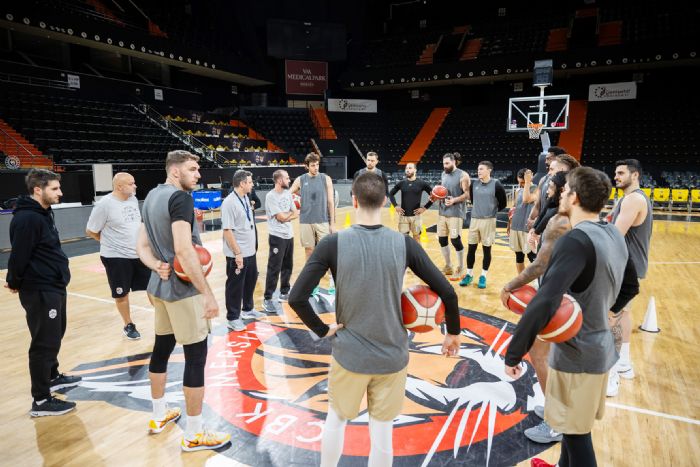 Karşılaşma öncesi Mersin Spor Koç Can Sevimin eşliğinde antrenmanlarını Servet Tazegül Spor salonunda gerçekleştiriyor.