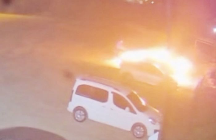 Olay anı ise saniye saniye güvenlik kamerasına yansıdı. Görüntülerde, kafasında kask bulunan motosikletli bir şahsın gelerek, yanıcı maddeyi aracın üzerine döktüğü ve ateşe verdiği anlar yer aldı.