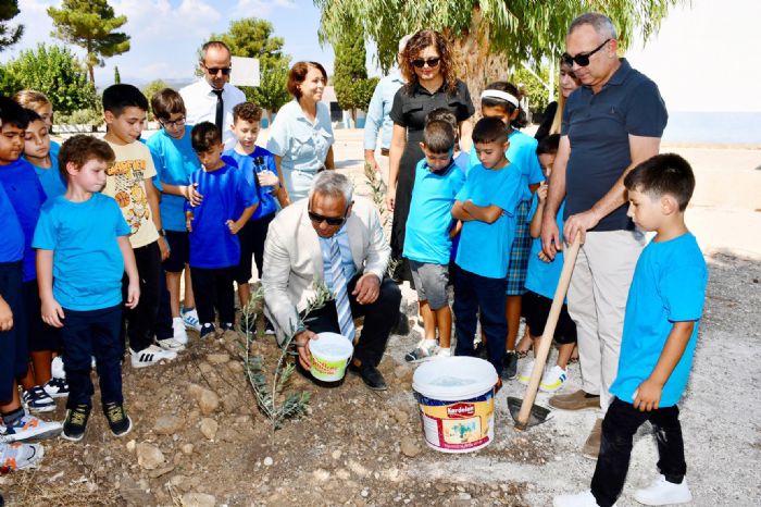 Etkinlik kapsamında "Her Çocuk Bir Fidan, İlk Ders Yeşil Vatan" temasıyla öğrenciler okul bahçesine zeytin fidanı dikti. (aa)