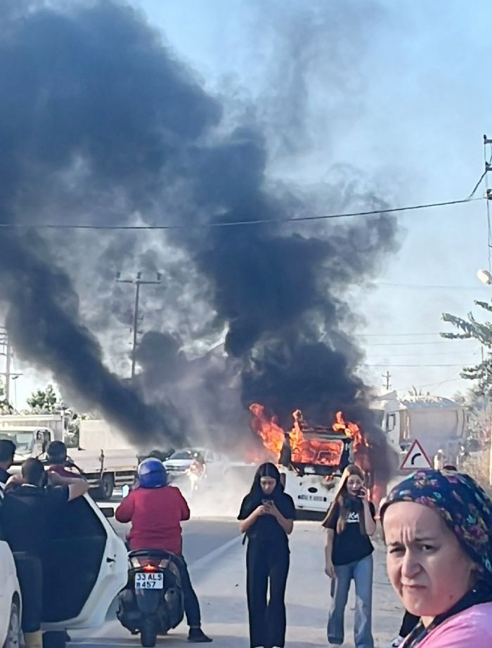 Mersin'in Erdemli ilçesinde yolcu taşıyan minibüs alev alev yandı. Sürücünün yolcuları hızla tahliye etmesi muhtemel facianın önüne geçti.