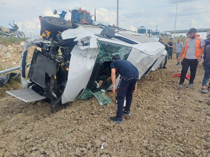 Sürücüsünün ismi ve plakası öğrenilemeyen servis minibüsü, Çukurova Uluslararası Havalimanı'nın bağlantı yolunda refüje çarpıp tarlaya devrildi.