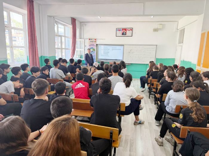 Öğrencilerle buluşan Mersin'in Anamur Cumhuriyet Başsavcısı Tanju Çatlı," Savcılık bir meslek değil, bir vicdan yolculuğudur. Biz, adaletin terazisini tutan elleriz. Sizler de büyüdüğünüzde hangi mesleği seçerseniz seçin, adil olun, dürüst olun, vicdanınızla yaşayın" dedi.