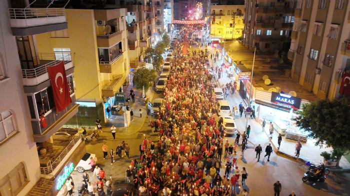 Cumhuriyet meydanında başlayan yürüyüşe yediden yetmişe vatandaşlar akın etti. Mehteranların öncülüğünde bir elde bayrak bir elde meşale ile yürüdüler.