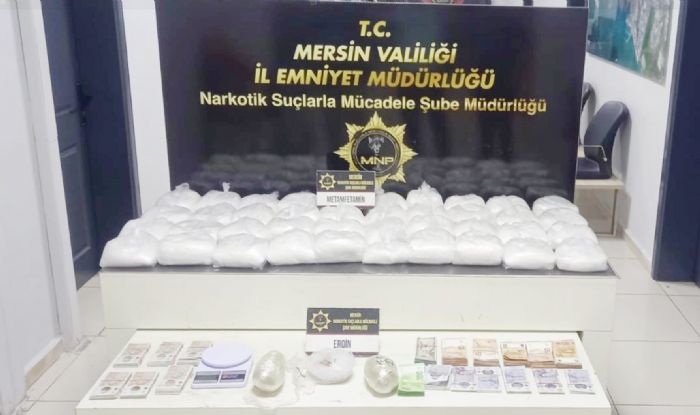 Mersin İl Emniyet Müdürlüğü Narkotik Suçlarla Mücadele ve İstihbarat Şubesi ekiplerinin koordineli olarak uyuşturucu ile mücadele çerçevesine çalışma yaptı. Ekiplerin teknik ve saha destekli ortak çalışmasının ardından belirlenen bir adrese operasyon gerçekleştirildi şüpheli R.A. yakalandı. Adreste yapılan aramada 38 kilo 590 gram metamfetamin ile 1 kilo 244 gram eroin maddesi ele geçirildi. Uyuşturucu madde ticaretinden elde edildiği değerlendirilen yaklaşık 4 milyon TL'lik 56 bin 500 Euro, 5 bin 250 dolar ve 12 bin 420 sterline de el konuldu.
