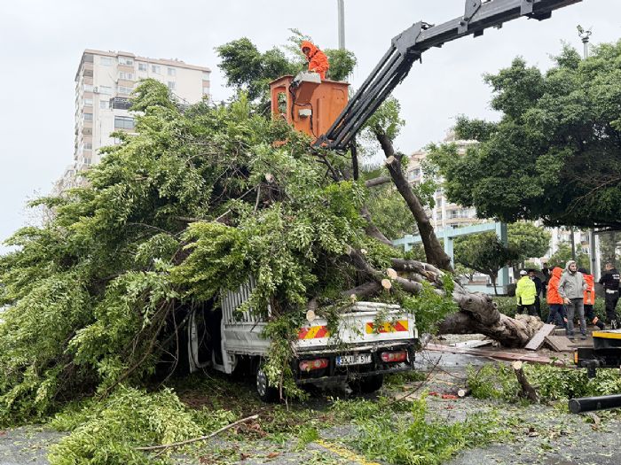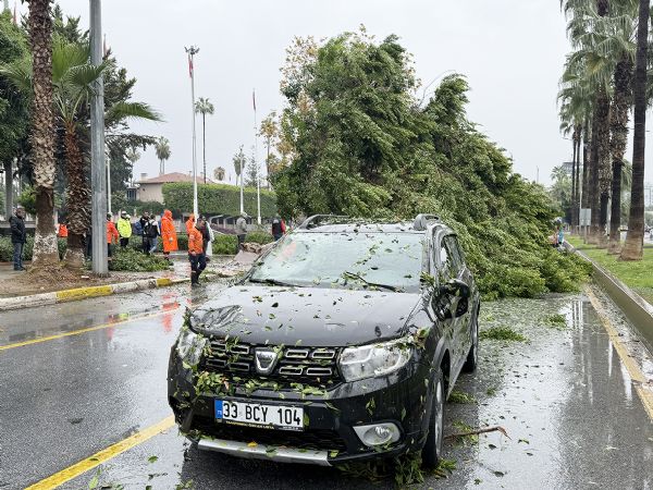 Mersin'in merkez Akdeniz ilçesinde rüzgarın etkisiyle devrilen ağaç, seyir halindeki kamyonet, otomobil ve yolcu minibüsünde hasara neden oldu. İlçede devam eden sağanakla etkili olan rüzgar nedeniyle Cumhuriyet Alanı'nın önündeki bir ağaç trafik akışının yoğun olduğu İsmet İnönü Bulvarı'na devrildi. Yoldan geçen 33 AUH 517 plakalı kamyonet, ağacın altında kaldı, dallar da 33 BCY 104 plakalı otomobilin ve 33 M 1055 plakalı yolcu minibüsünün üzerine düştü. Bu sırada minibüs, önündeki kamyonete çarptı. Olay yerine polis ve itfaiye ekipleri sevk edildi. Araçlarda hasara neden olan ağacın kaldırılması için itfaiye ekiplerince başlatılan çalışma sürüyor. (iha)