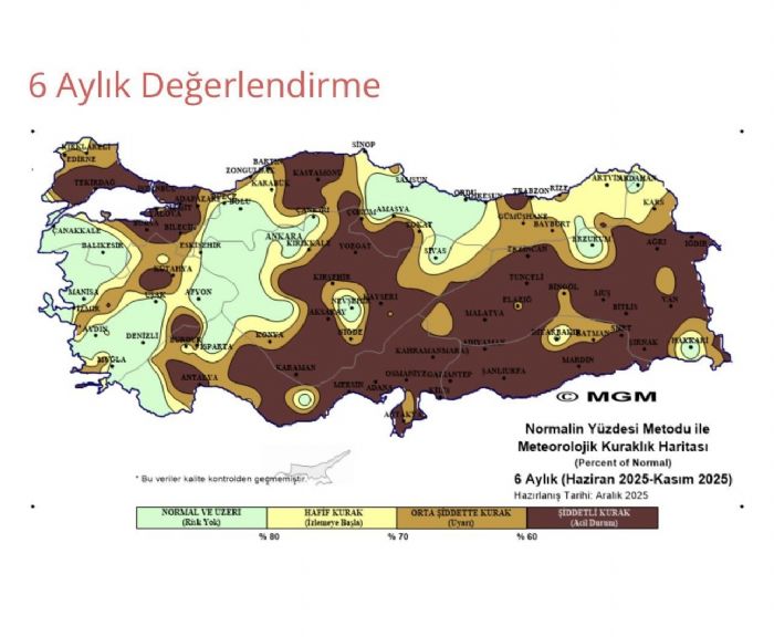 Meteoroloji Genel Müdürlüğü’nün (MGM) kuraklık haritalarına göre Kasım ayı da kurak geçti. MGM, Normalin Yüzdesi Metodu (PNI) ile hazırladığı aylık, 3 aylık ve 6 aylık kuraklık değerlendirme haritası yayımlandı.