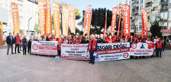 DİSK’e bağlı Genel İş Sendikası Mersin Şubesi üyeleri, “Asgari değil insanca yaşanacak ücret” afişi ile sendikadan Özgür Çocuk Parkına yürüyerek bir basın açıklaması yaptı.