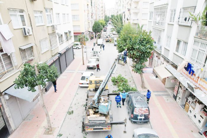 Hafta sonu gerçekleşen çalışmaya, Motorize Emniyet Güçleri ile Akdeniz Zabıta Müdürlüğü ekipleri de destek verdi. Çalışma öncesi sokak araç trafiğine kapatılıp çevrede güvenlik önlemi aldı. Ardından başlayan çalışmalarda Park ve Bahçeler Müdürlüğü görevlileri, 3 kovalı araç, kepçe, traktör ve kamyonlar yardımıyla 5338 sokak boyunca uzanan onlarca ağacı budadı. Ortaya çıkan dal ve yapraklar da personel tarafından kepçe yardımıyla toplanıp kamyon ve traktöre yüklendi ve mahalleden çıkarıldı.