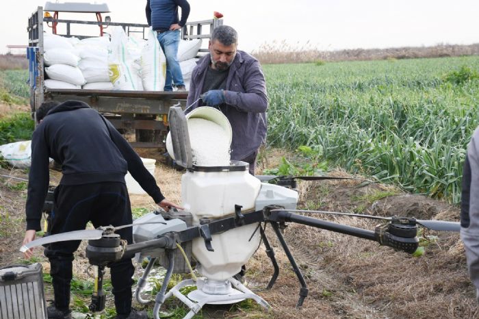 Bu çerçevede Mersin'in Tarsus ilçesinde bulunan 200 dönümlük pırasa tarlasında dronla gübreleme çalışması gerçekleştirildi. 50 kilo taşıma kapasiteli dronlara yüklenen gübreler, kısa sürede ve dengeli şekilde araziye uygulandı. 2 işçinin 3-4 saatte yapabileceği işi yarım saatte yapan dronun dönüm başına üreticiye ise yaklaşık 120 TL civarında maliyeti olduğu öğrenildi.