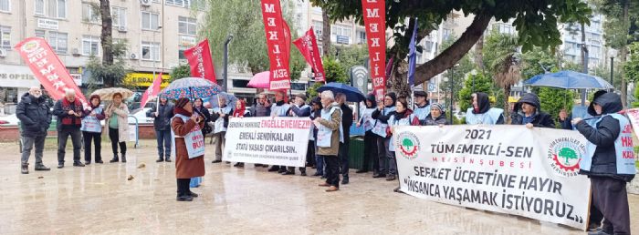 2021 Tüm Emekli Sen Mersin Şubesi üyeleri yağmur ve soğuk havaya rağmen merkez Akdeniz ilçesindeki Özgür Çocuk Parkında bir araya gelerek, talepleri için bir kez daha iktidara seslendi. “Sefalet ücretine hayır insanca yaşamak istiyoruz” pankartı açarak bir basın açıklaması yapan emeklileri emek ve demokrasi güçleri de yalnız bırakmadı.
