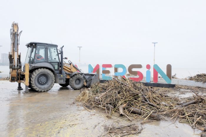 Mezitli Belediyesi ekipleri de yağışın etkisiyle sürüklenen çamur, kütük ve ağaç parçalarının biriktiği kıyı şeridini temizliyor.