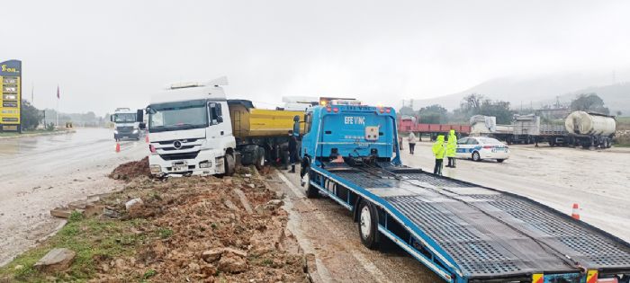 Mersin'in Silifke ilçesinde, refüje çıkan tırda maddi hasar oluştu. Ali K. idaresindeki plakası öğrenilemeyen tır, Silifke-Antalya kara yolu Akdere mevkisinde yağmur nedeniyle kayganlaşan yolda sürücünün direksiyon hakimiyetini kaybetmesi sonucu refüje çıktı. Haber verilmesi üzerine bölgeye polis ekipleri ve çekici sevk edildi. Kaza nedeniyle kara yolunda ulaşım bir süre tek şeritten kontrollü olarak sağlandı. Herhangi bir yaralanmanın yaşanmadığı kazada, tırda maddi hasar oluştu. (aa)