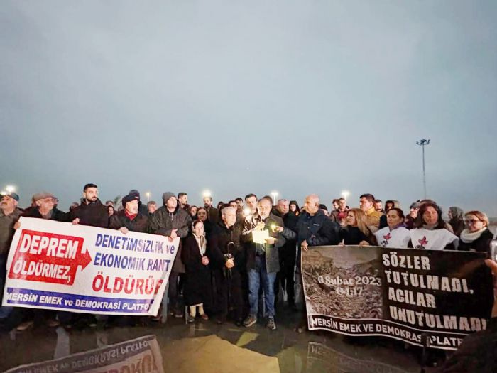 Mersin Emek ve Demokrasi Platformu tarafından Mado önünde yapılan açıklamada, “Deprem öldürmez, denetimsizlik ve ekonomik rant öldürür, sözler tutulmadı acılar unutulmadı” pankartı açıldı. Meydanda yapılan basın açıklamasını Makina Mühendisleri Odası (MMO) Mersin Şube Başkanı ve Platform Dönem Sözcüsü İsmail Oğuz okudu.