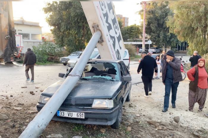 Mersin'in Erdemli ilçesinde kamyonun çarptığı tabela park halindeki otomobilin üzerine devrildi. Kazada kamyon şoförü yaralandı.