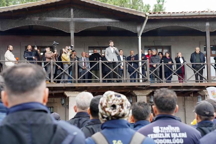 Tarsus Belediye Başkanı Ali Boltaç, Başkanlık Binası önünde belediye personeline hitap ederek belediyenin mali yapısından personel haklarına, maaş düzenlemelerinden yeni araç yatırımlarına kadar birçok başlıkta açıklamalarda bulundu. Programa DİSK Genel-İş Sendikası Mersin Şube Başkanı Kemal Göksoy da eşlik etti.
