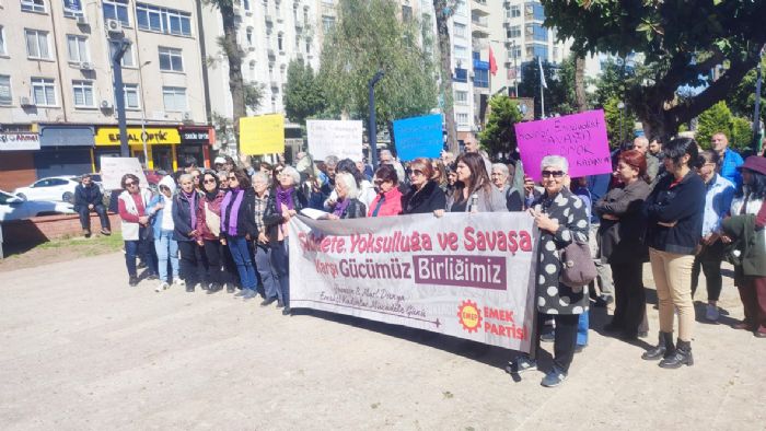Burada yapılan basın açıklamasını okuyan Emek Partili Kadınlar adına Seher Peşmen, “Bugün 8 Mart: Yoksulluğa, şiddete ve savaşa karşı mücadelemiz var. Zamlar, boş tencereler, ödenemeyen kiralar, işsizlik, kabaran borçlar… Uzayan mesailer, güvencesiz işler, düşük ücretler… Sokakta güvensizlik, işyerinde baskı, evde şiddet… Gericilik, adaletsizlik, geleceksizlik… Şiddet dolu hayatlarda ayakta kalma çabası… İktidar sözcülerinin aymazlıkları, meclisin her an halk düşmanı yasalarla bizi nefes alamaz hale getirmesi, halkın derdiyle dalga geçişleri… Emperyalist haydutların tehditleri, bombaları ve savaşları…