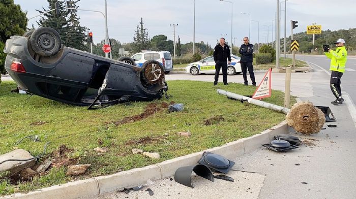Mersin’in Erdemli ilçesinde aydınlatma ve trafik ışıklarının direğine çarpıp ters dönerek sürüklenen otomobil de bulunan 2 kişi yara almadan çıktı.
