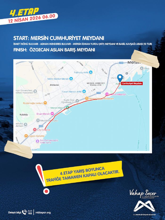 Final etabı ise Mersin Cumhuriyet Meydanı’ndan başlayacak. İsmet İnönü ve Adnan Menderes bulvarlarını kapsayan parkurda sporcular, şehir merkezinde tur atacak ve yarışı Özgecan Aslan Barış Meydanı’nda bitirecek.