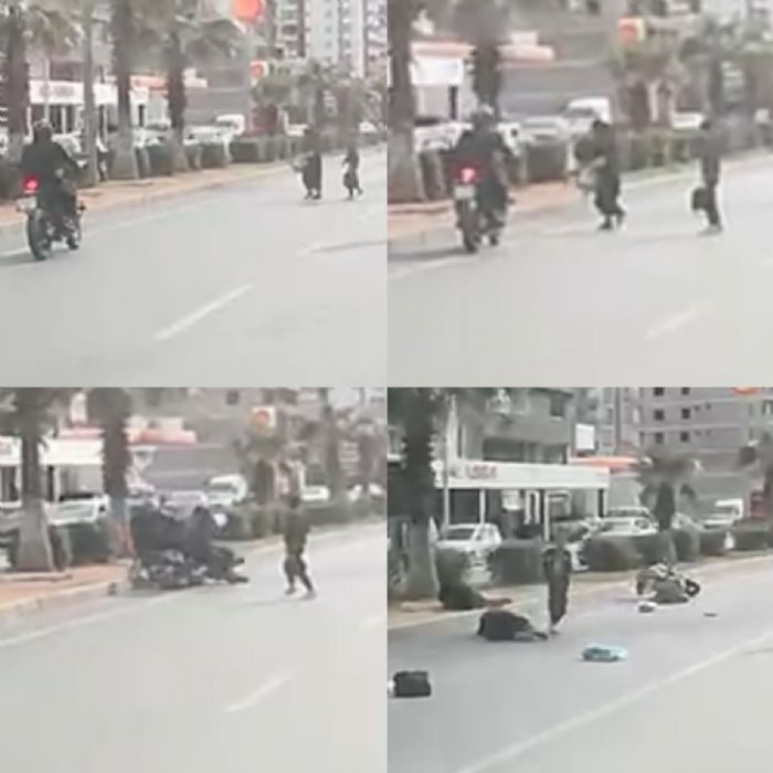 Öte yandan kaza anı ise bir aracın kamerasına yansıdı. Görüntülerde yaya geçidi olmayan yerden geçen kadına, motosikletin çarpma anı ve savrulmaları yer aldı.