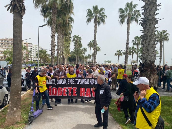 KESK Şubeler Platformu çağrısıyla Kushimoto Sokağı girişinde bir araya gelen eğitimciler, buradan Mersin İl Milli Eğitim Müdürlüğü’ne yürüdü. ‘Sokakta, okulda, evde, toplumsal her alanda şiddete hayır’ pankartıyla gerçekleştirilen yürüyüşte eğitimciler, tepkilerini ve taleplerini dile getirdi. Yürüyüş sonunda grup adına konuşan Mahmut Sümbül, Şanlıurfa Siverek’te bir okulda yaşanan silahlı saldırının üzerinden henüz 24 saat bile geçmemişken, Kahramanmaraş’ta bir ortaokulda gerçekleşen saldırının herkesi derinden sarstığını belirterek, “Ayser Çalık Ortaokulu’nda yaşanan bu saldırıda 1’i öğretmen, 9’u öğrenci olmak üzere 10 kişi yaşamını yitirmiş, çok sayıda öğrencimiz yaralanmıştır.